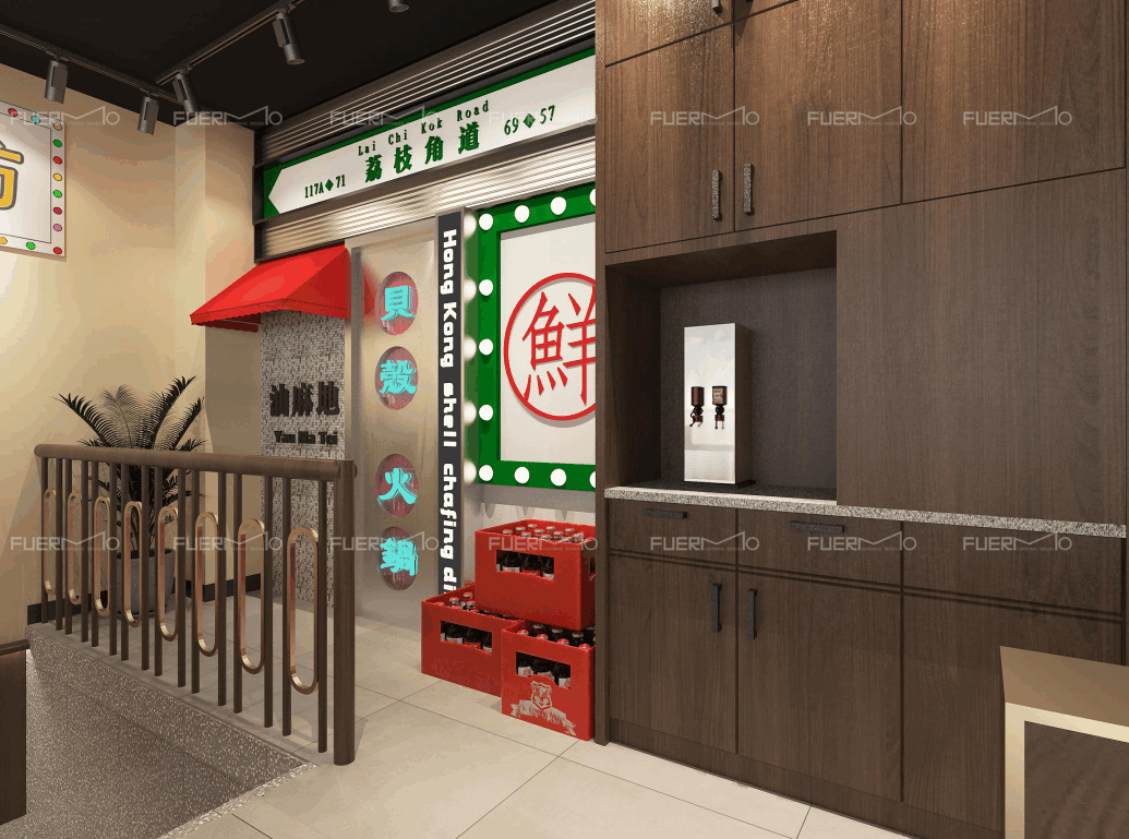 设计理念:本案根据港风元素与品牌自身文化结合,形成独树一帜具有街头烟火气的空间氛围。墙面大面积使用马赛克砖、以及香港地铁站元素,使用灯箱招牌霓虹灯等大量点缀元素,一秒钟带人回到上个世纪繁华的香港街头
